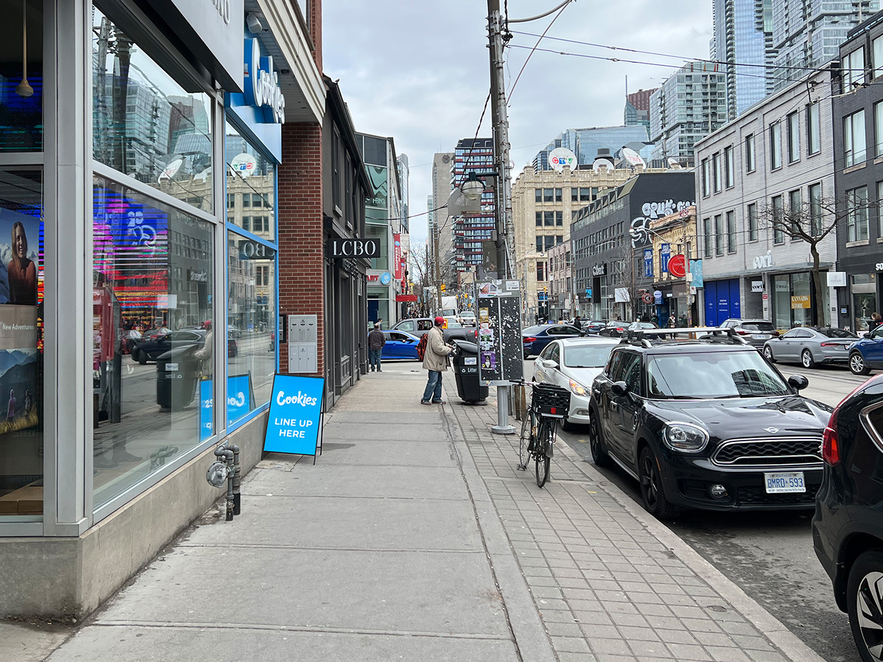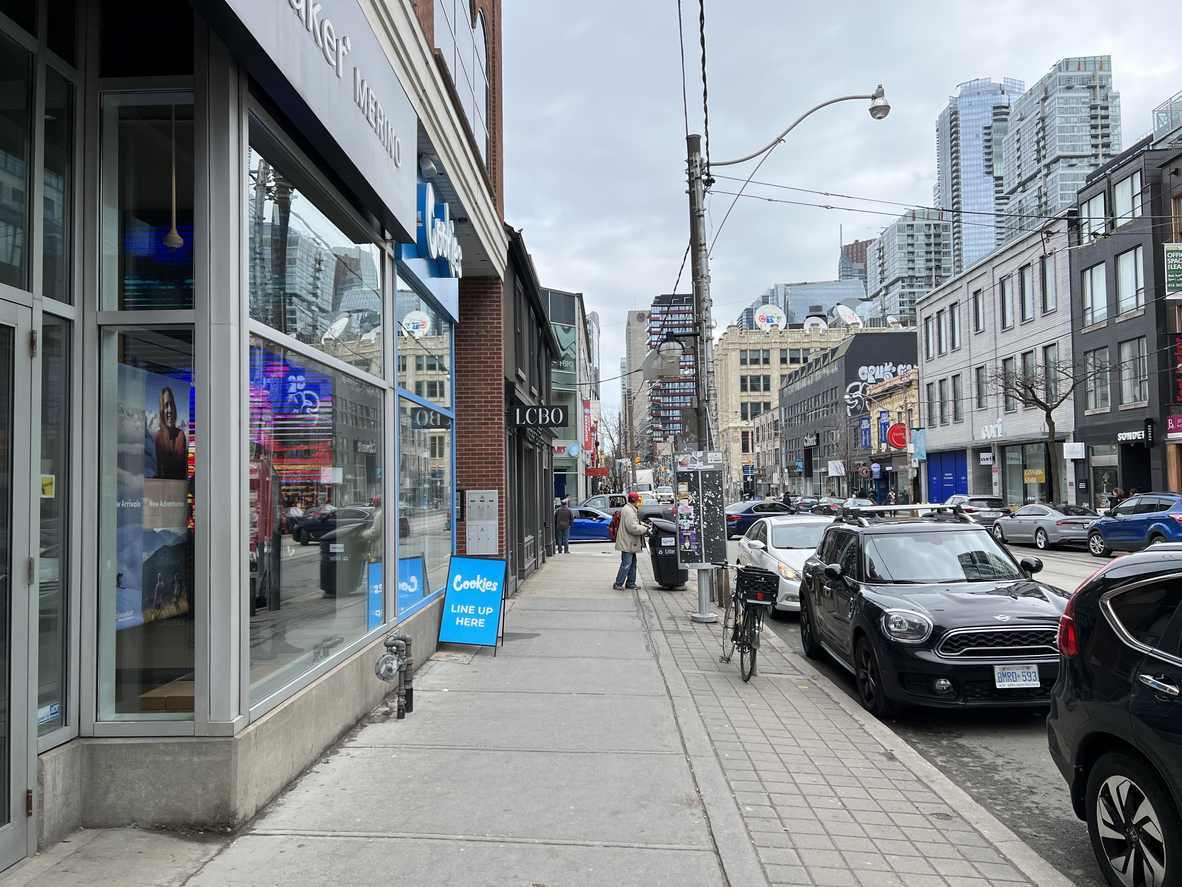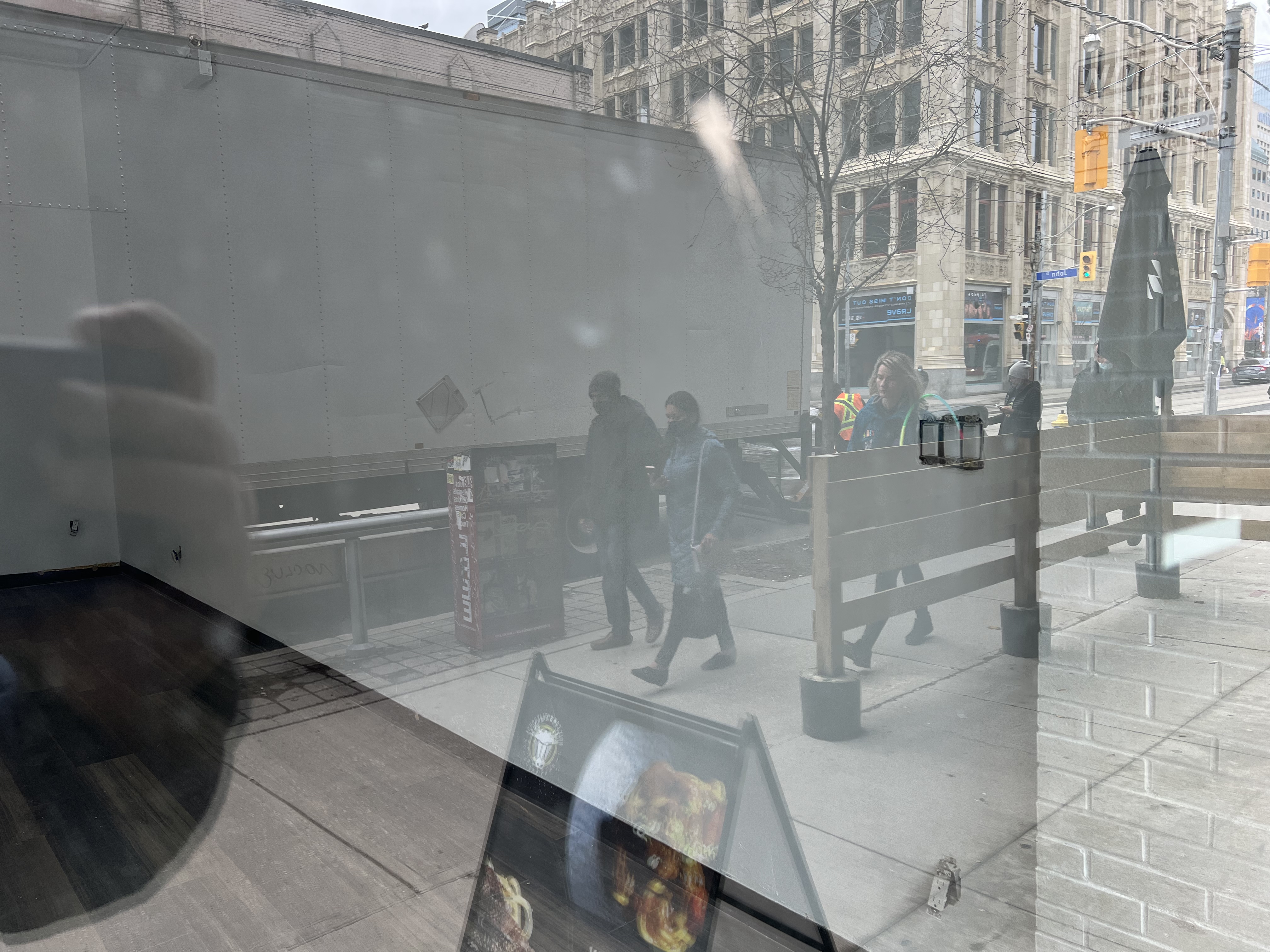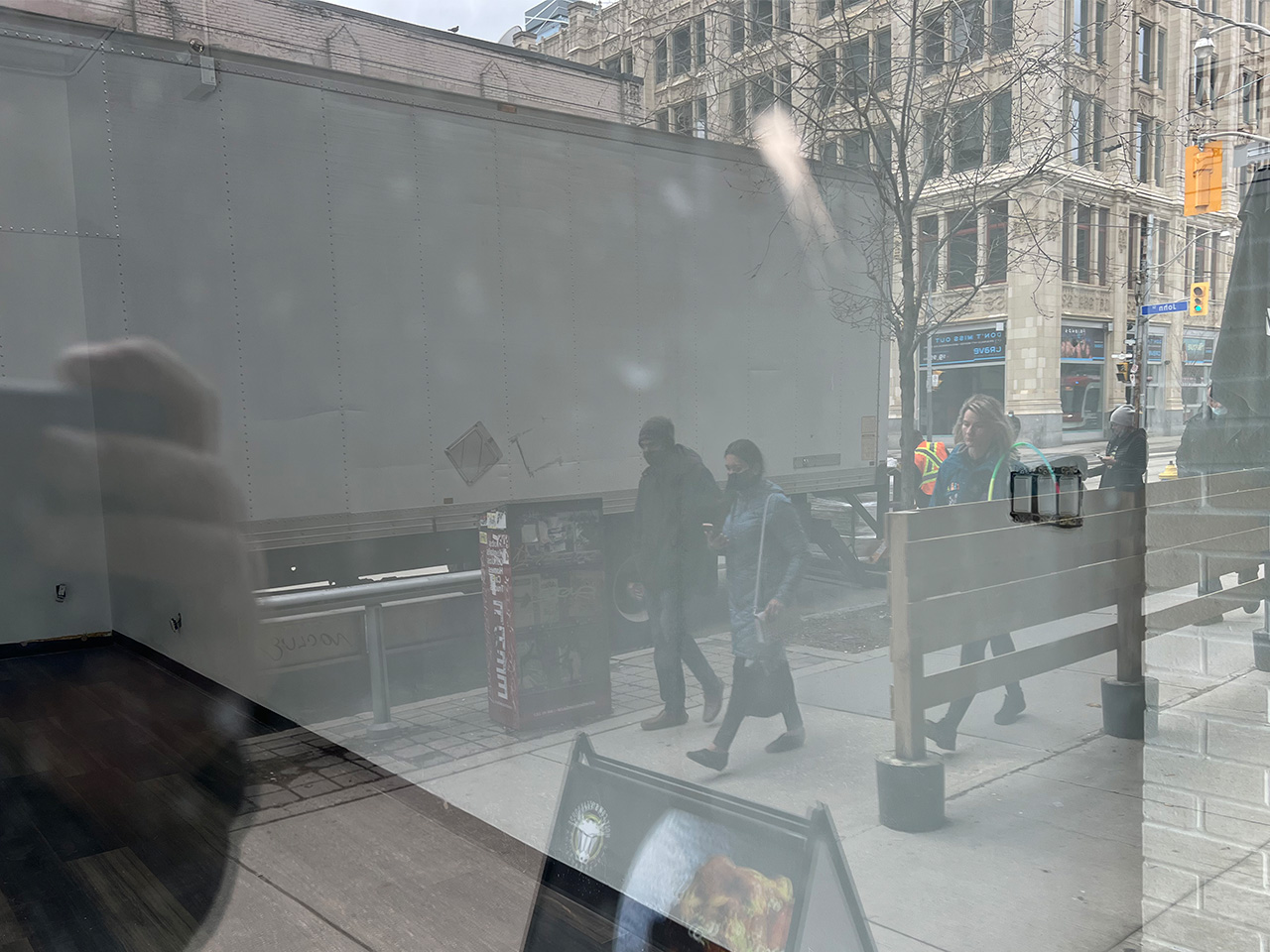 Through the window of what was Pages bookstore at 256 Queen St West, which in March 2022 was for lease and vacant.