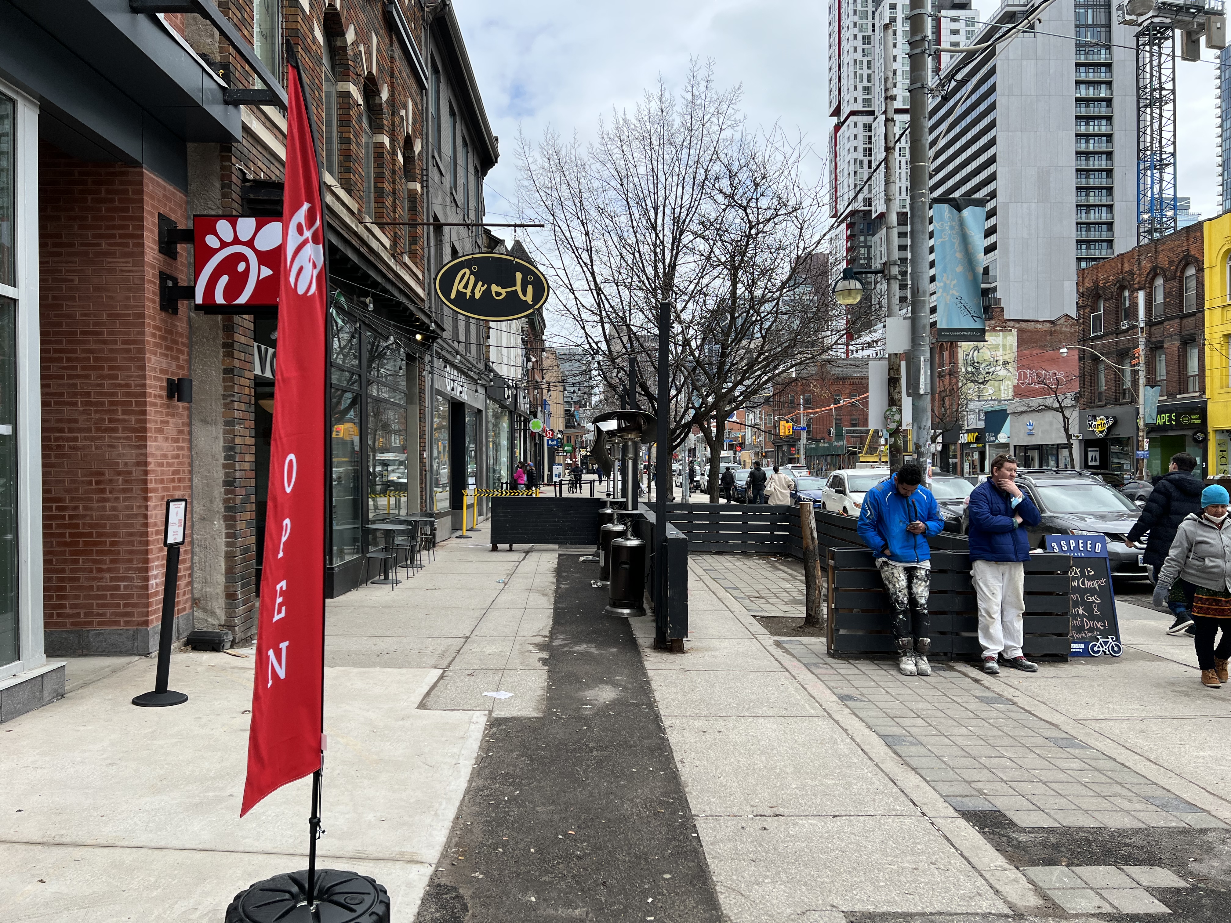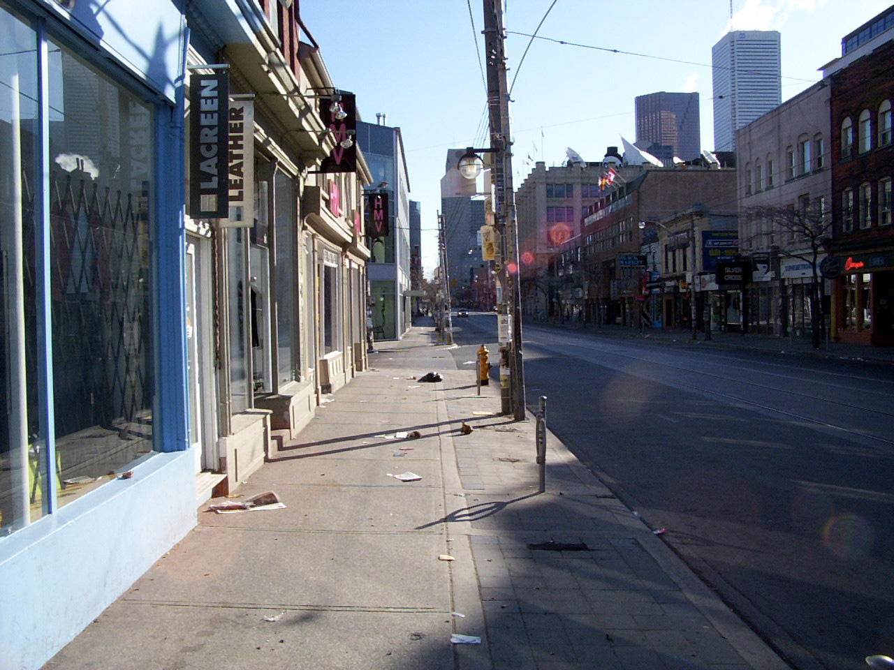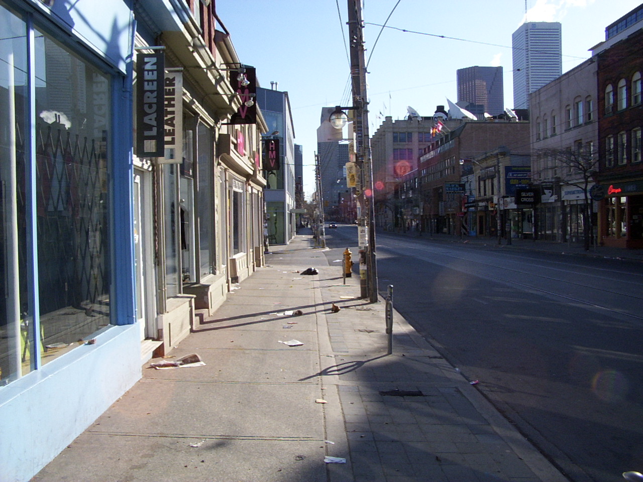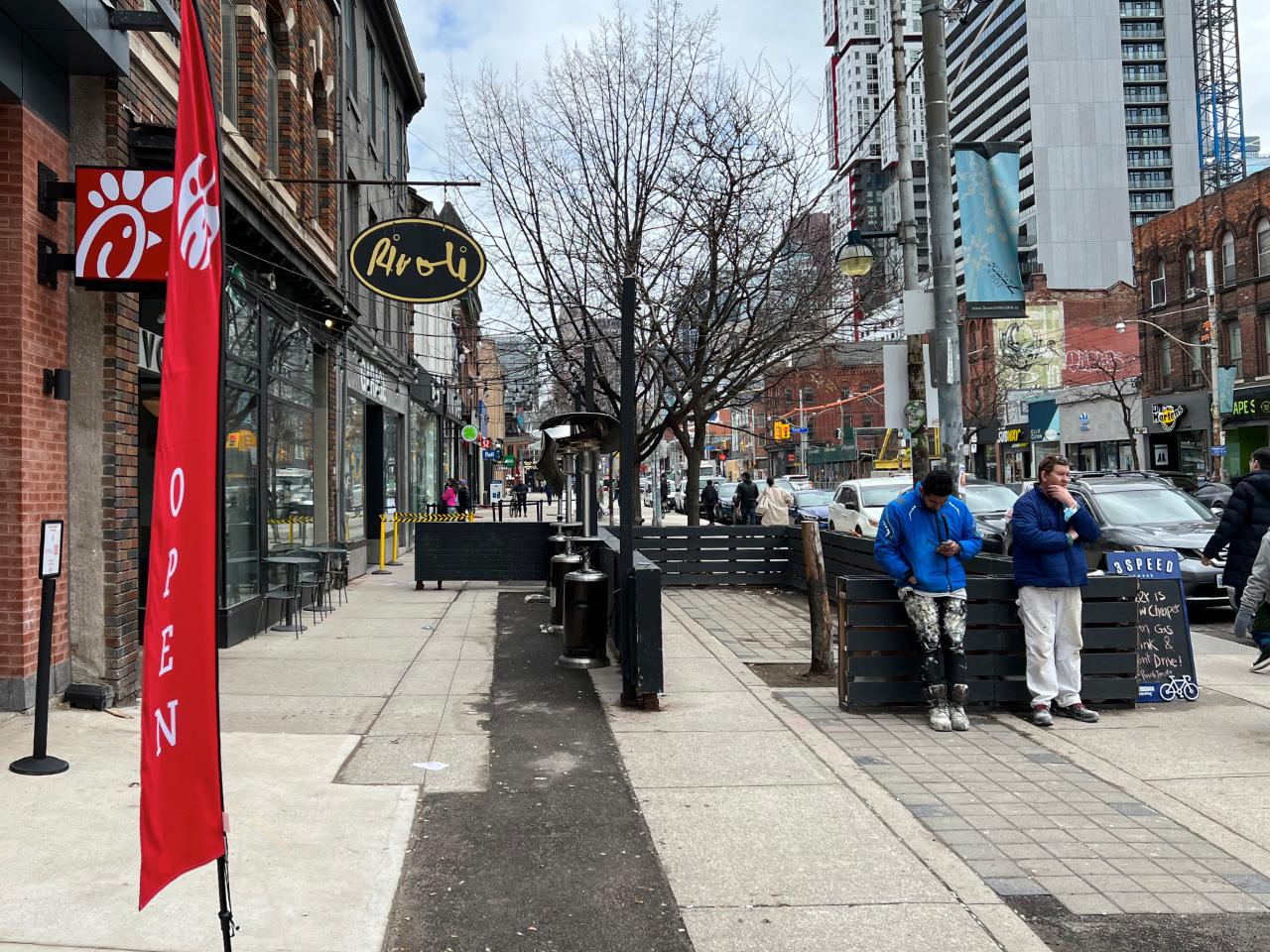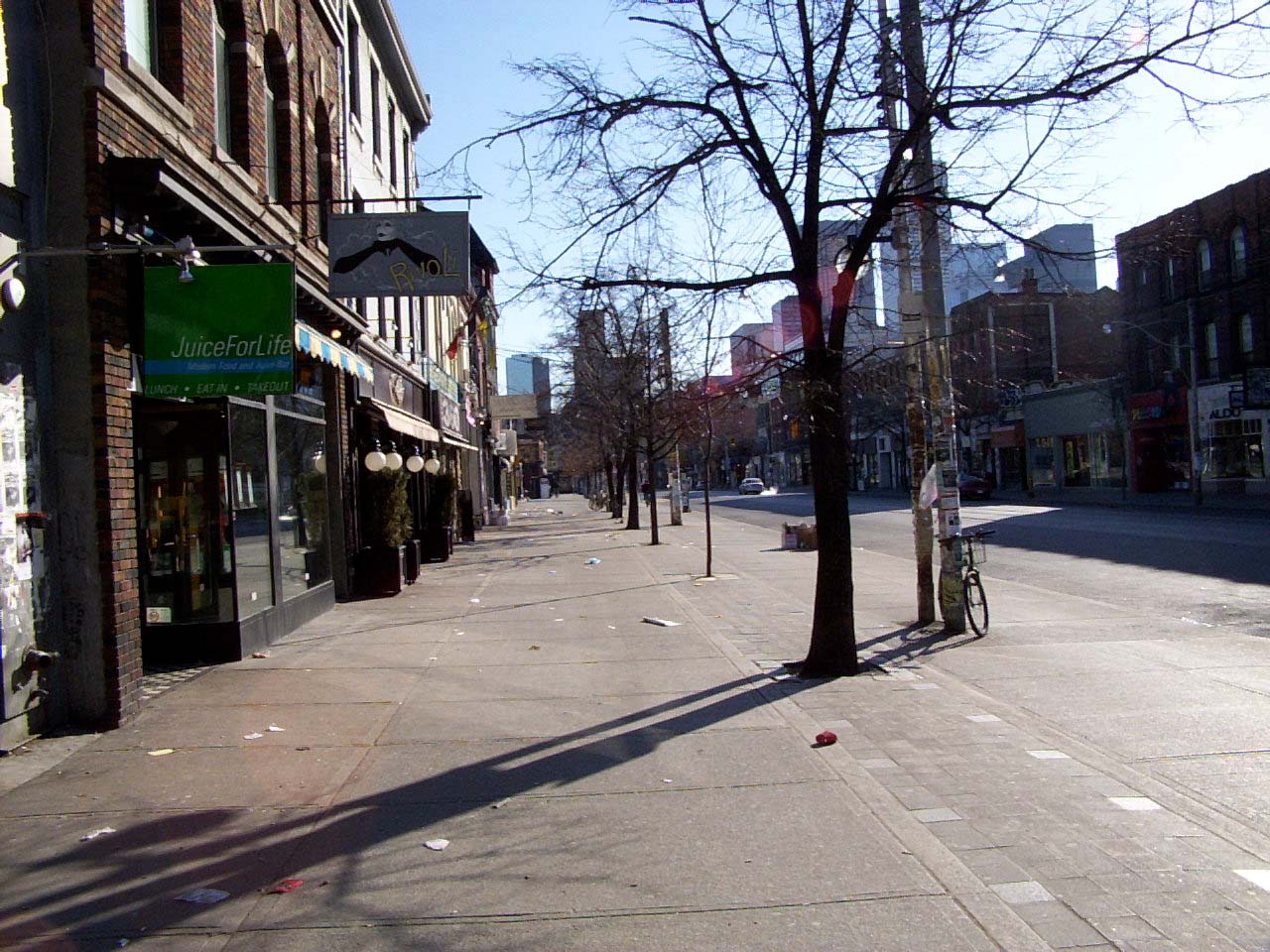 Through the window of what was Pages bookstore at 256 Queen St West, which in March 2022 was for lease and vacant.