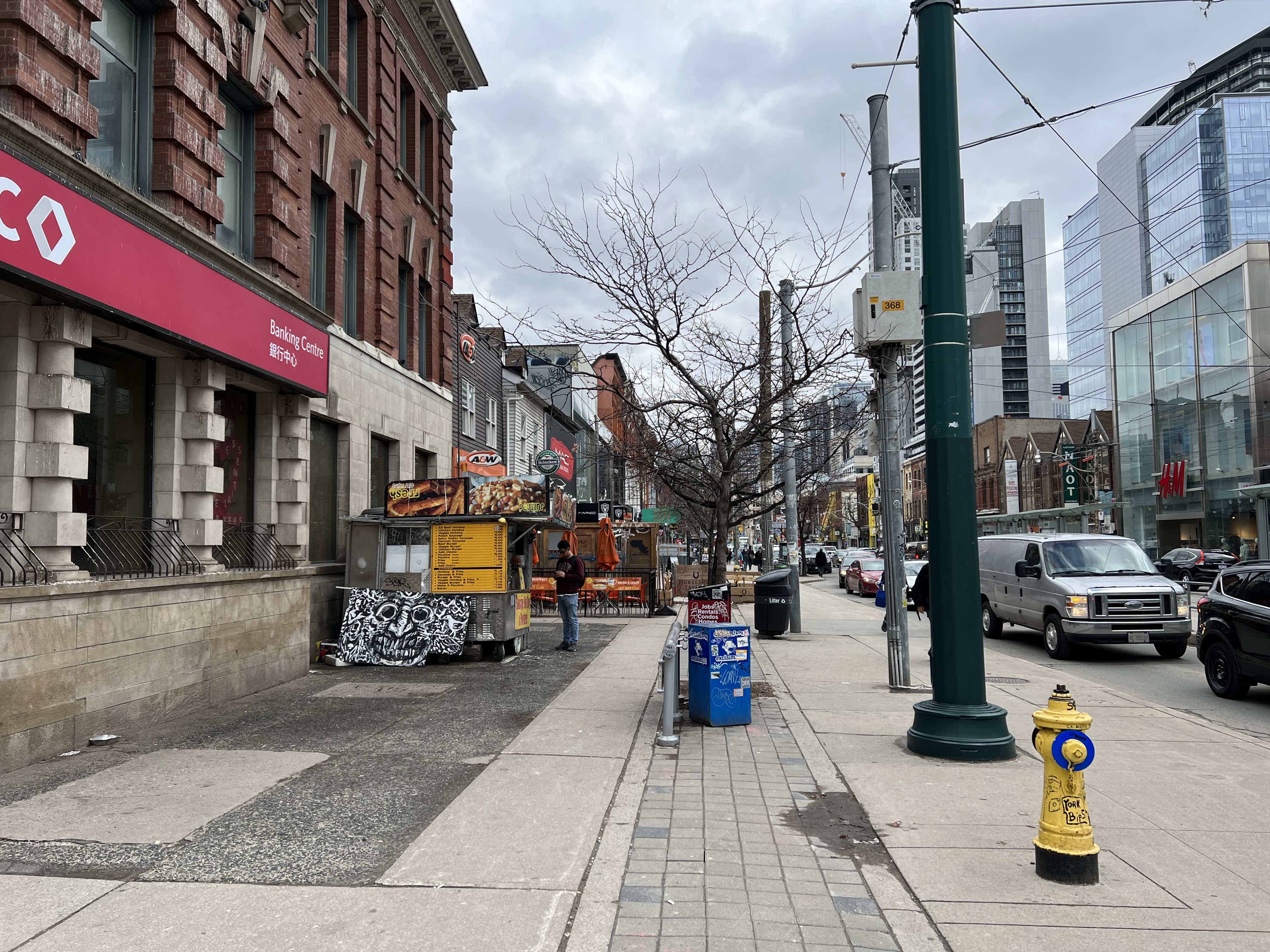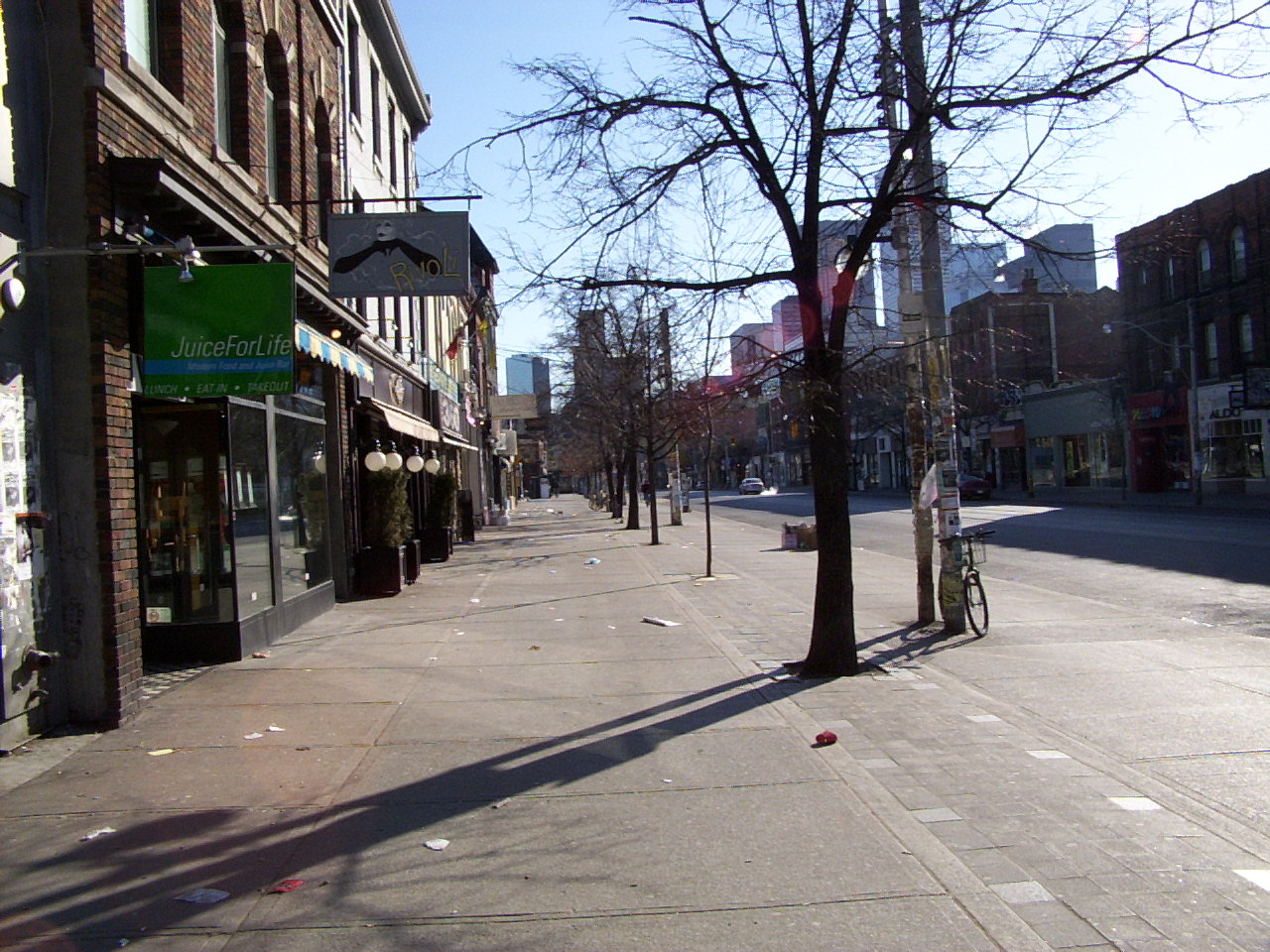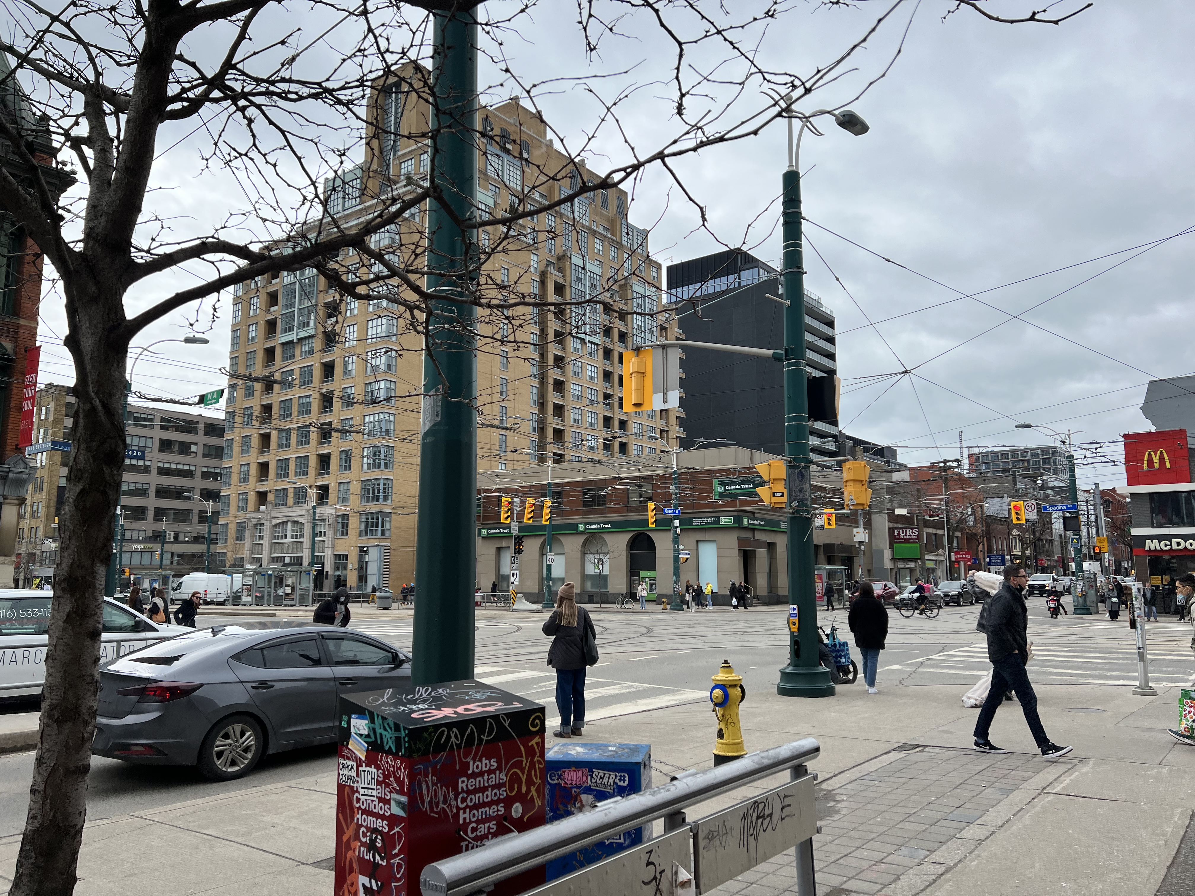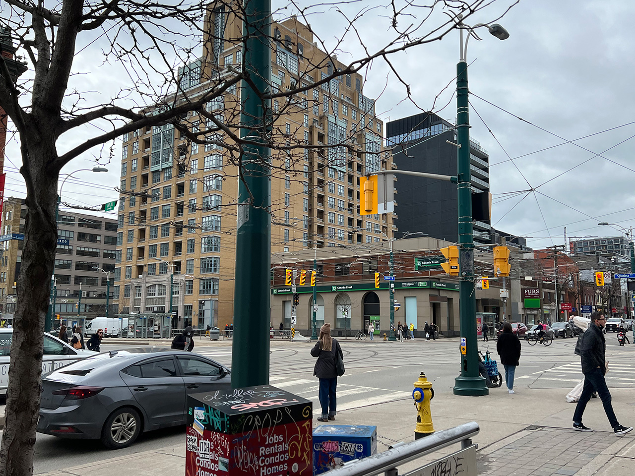 Through the window of what was Pages bookstore at 256 Queen St West, which in March 2022 was for lease and vacant.